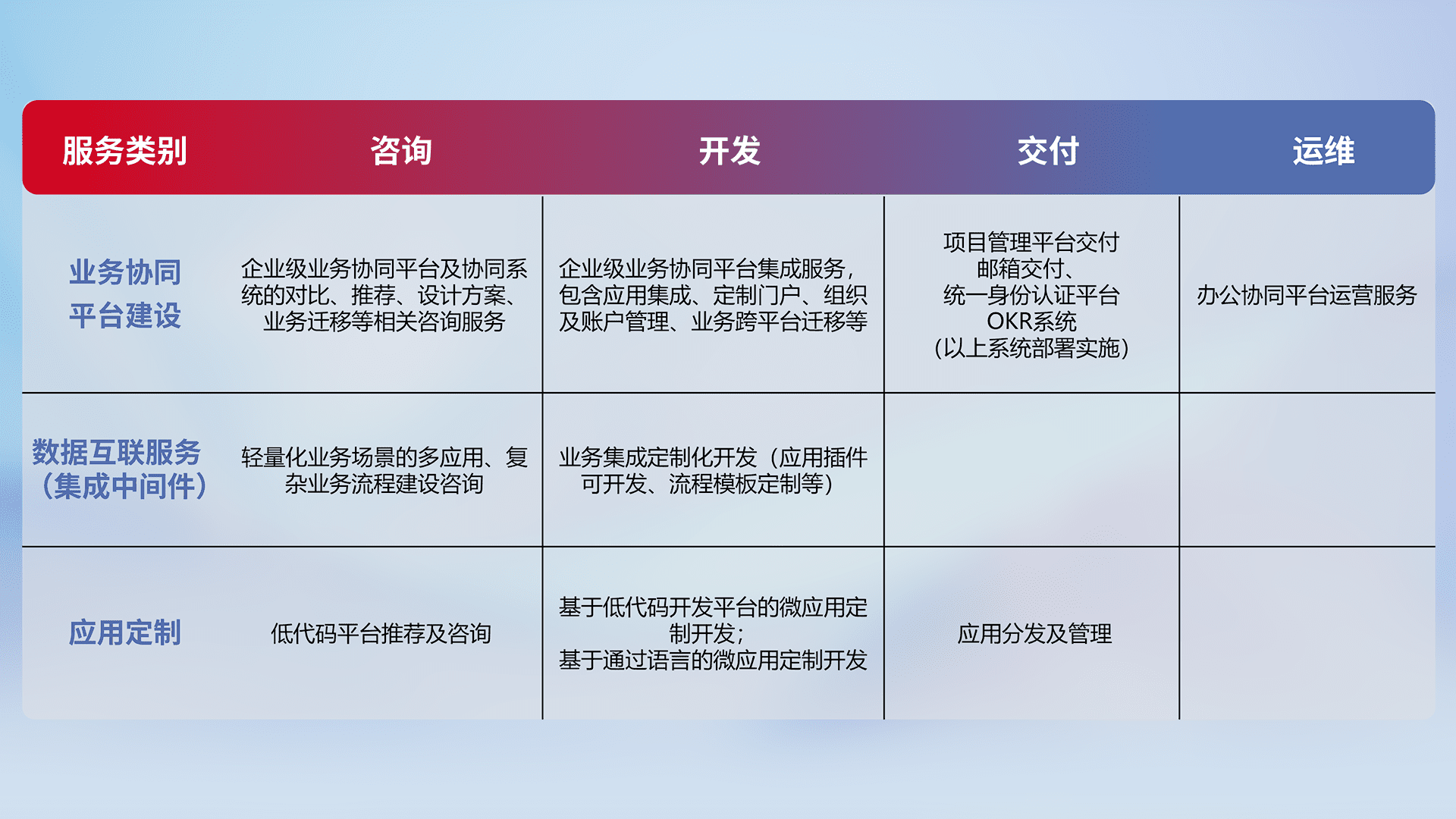 针对钉钉、、企微、、、、IDaas等平台级产品提供产品的规划、、、、方案、、、交付、、定制化开发等服务,,,实现如统一协同办公、、、、智能客户服务、、、混合会议管理、、、智能数据查询、、等业务场景,,实现数字化转型。。