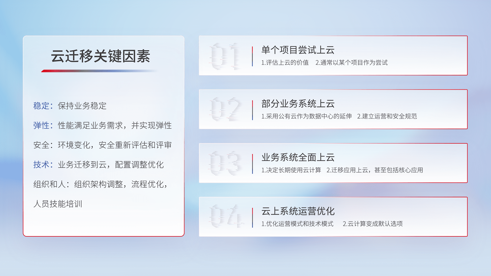 结合实际业务,,,从规划设计、、、、云平台选型、、、云原生改造、、、、数据迁移、、、集成交付,,迁移全过程为客户识别最佳上云路径,,做好风险识别管理,,设计网络架构、、、、身份权限、、、、安全审计合规、、、、操作审计、、、、日志审计、、、、监控告警策略、、多站点容灾设计等,,,,对云上基础设施进行整体规划,,,,提升IT治理水平,,以满足弹性、、、、高可用、、、高性能的需求。。
