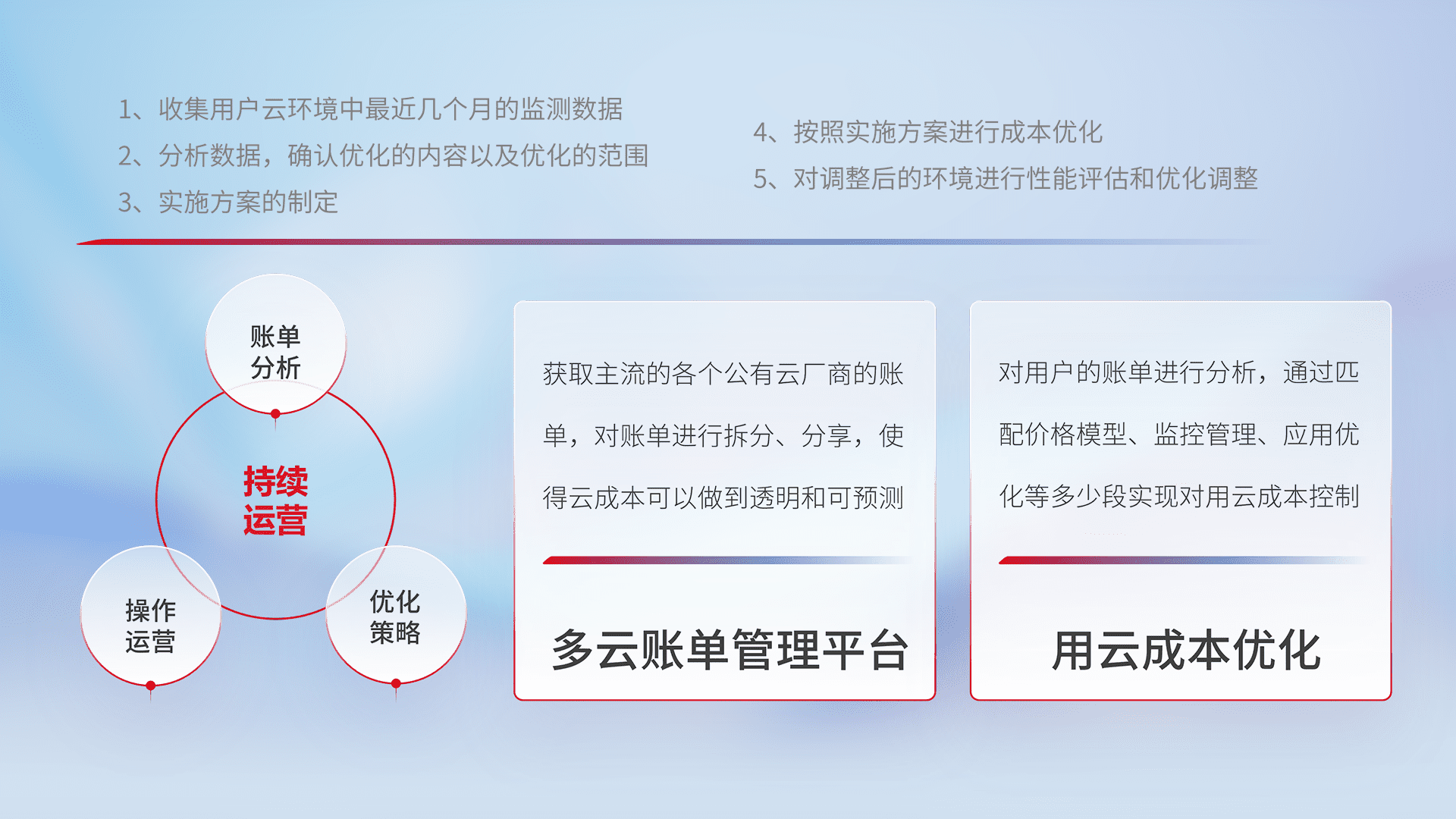 通过多云纳管,,以统一的资源数据模型把客户的云资源进行抽象和封装,,,,进而实现对多云资源的统一操作,,,,保障云资源管理的可靠性、、、、稳定性与可用性。。量身定制化运维内容,,,配置、、、开发运维、、、补丁管理、、备份、、、监控、、、认证和访问管理、、、、审计和日常巡检等,,,,保障在用云过程中的可靠度,,,,稳定度以及高可用率。。